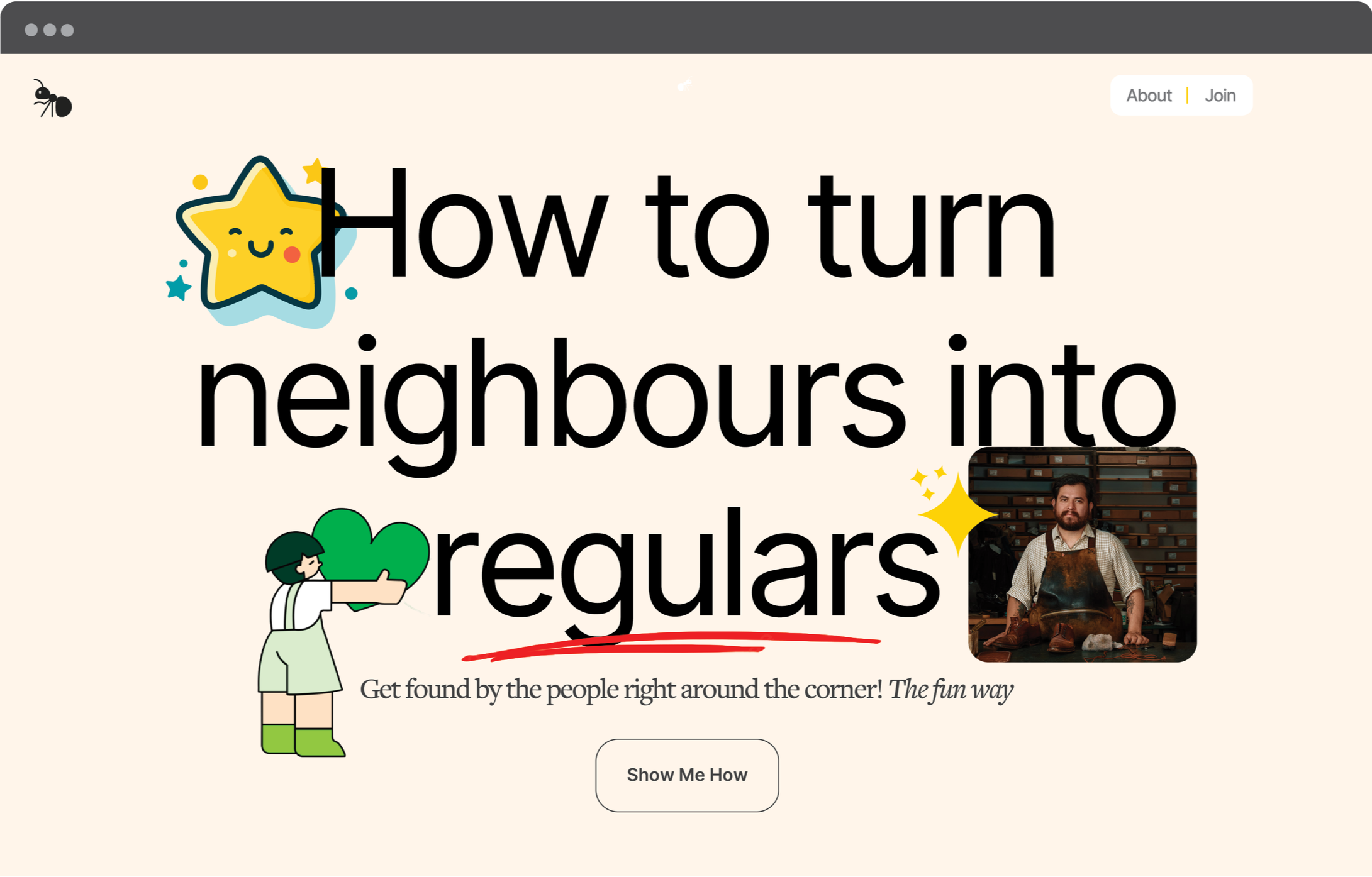Antsy™ replaces that hope with a steady stream of curious neighbours. We don't make ads—we build local connections that make people feel like they're discovering a local secret.